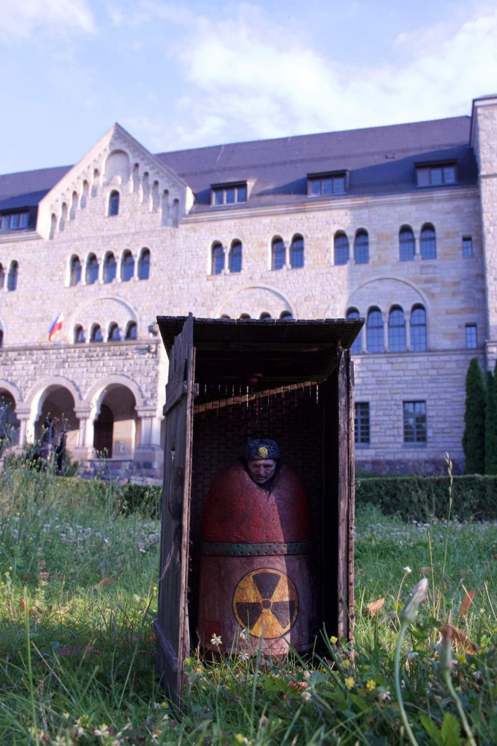 «Мне это казалось абсурдным и опасным. Я решил выразить это в саркастической форме, воплотив ее в таком виде. Это старая ржавая боеголовка, из которой торчит военная фуражка. На корпусе ракеты можно увидеть флаг СССР, инвентарный номер, срок годности (который давно истек) и прочие атрибуты старого совка. В середине боеголовки находится динамик, из которого доносятся популистские заявления и характерные звуки дозиметра (счетчика Гейгера). Сама боеголовка размещена в деревянном сарае, напоминающем старинный туалет. На его двери висит табличка с облупившейся надписью «Запрашаем!», где четко видны только четыре буквы — Р, А, Ш, А», – описывает инсталляцию художник.