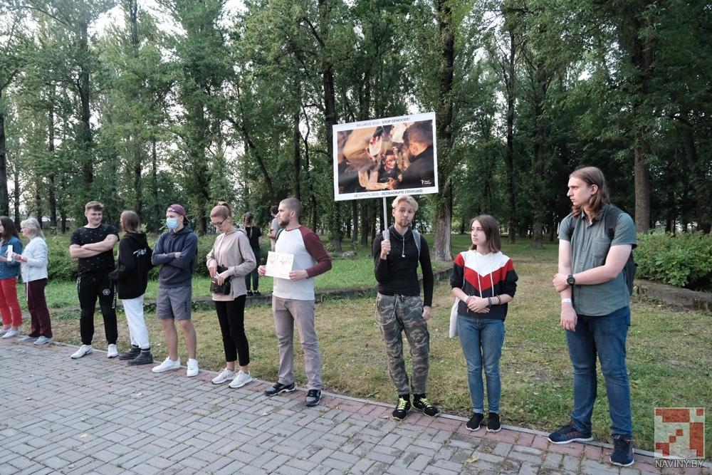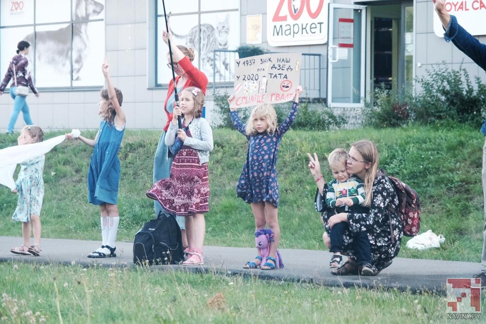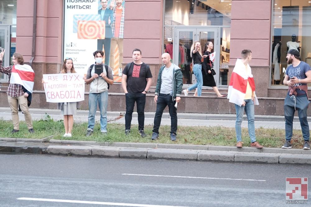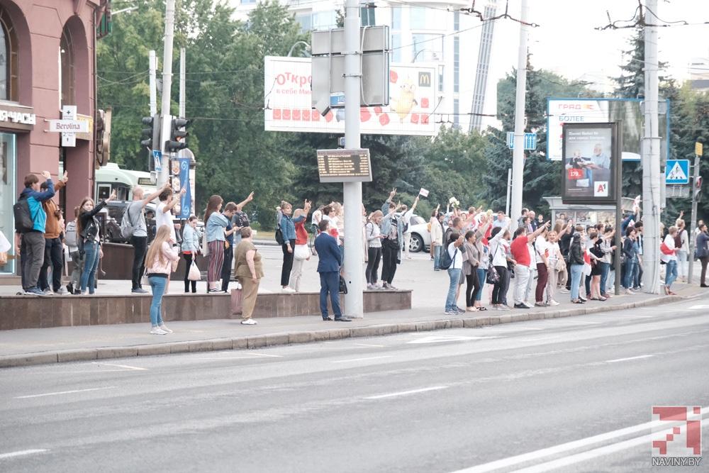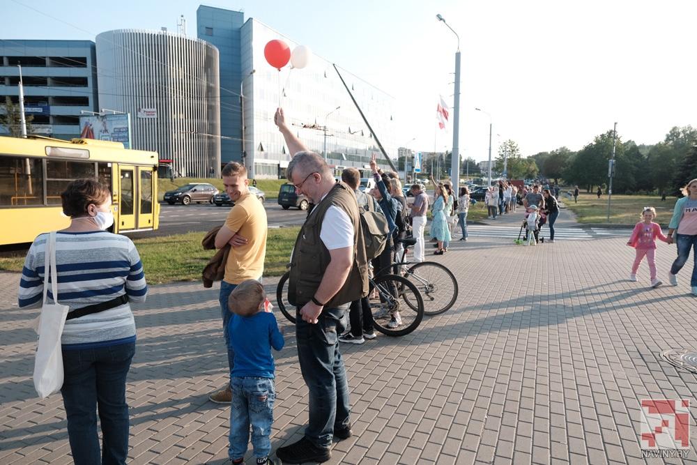 Участники акции стояли с цветами, бело-красно-белыми флагами и плакатами, осуждающими насилие со стороны силовиков. Проезжающие мимо автомобили сигналили в знак поддержки.