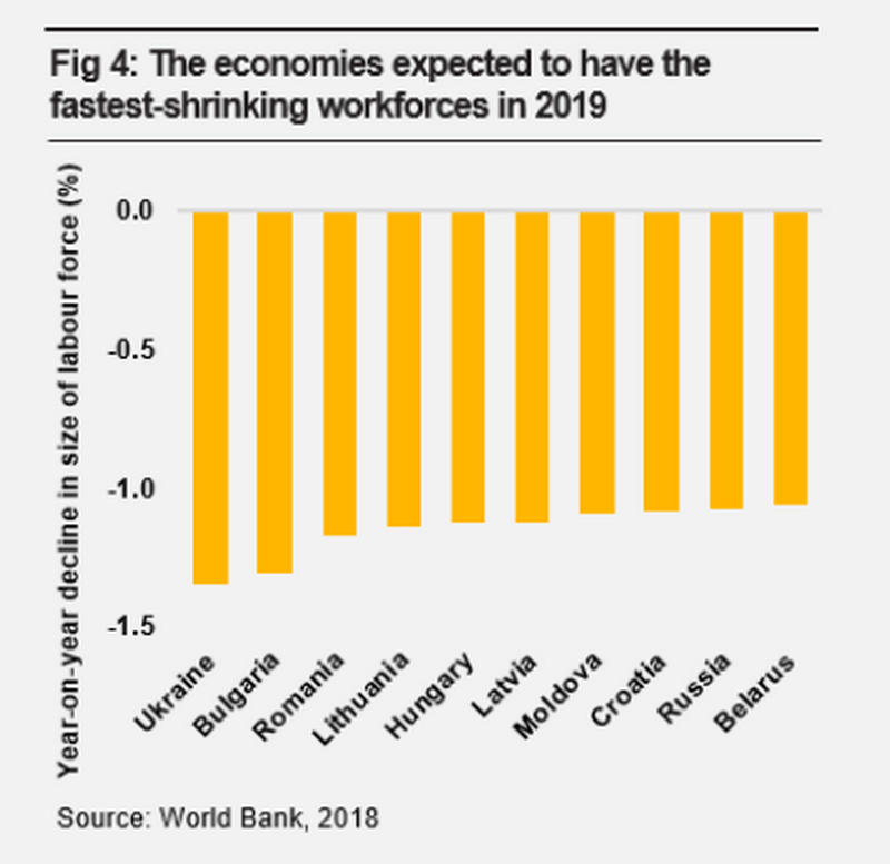 При этом сокращение трудовых ресурсов наблюдается во всех 23 странах региона Восточной Европы.