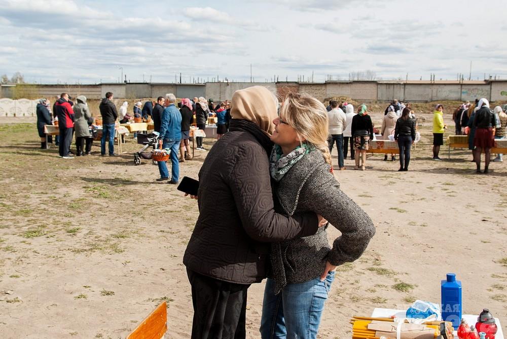 В храм в честь святого праведного Иоанна Русского, который находится в микрорайоне Ковалево в районе жилой застройки между улицами Суворова и Ясеневой, пришло не мало людей. Некоторые из них были в защитных масках. Люди ставили корзинки со снедью на специальные столы на улице.