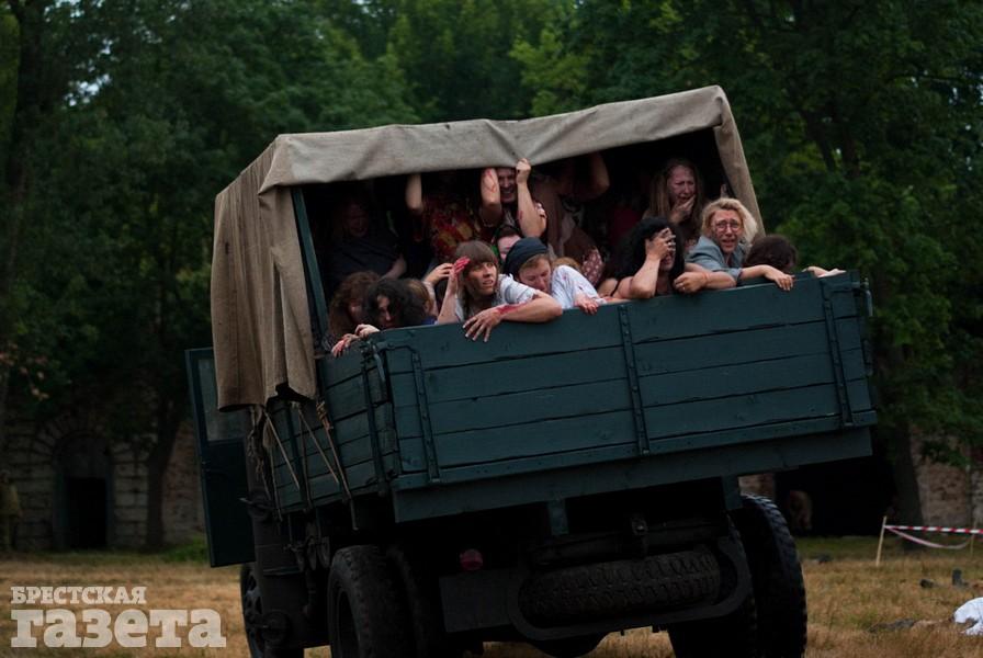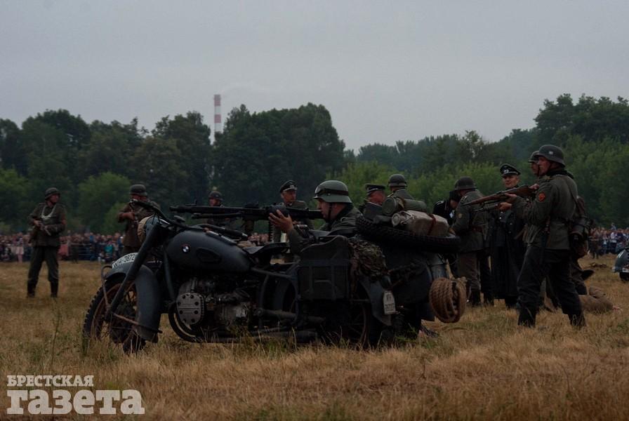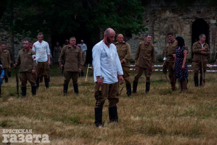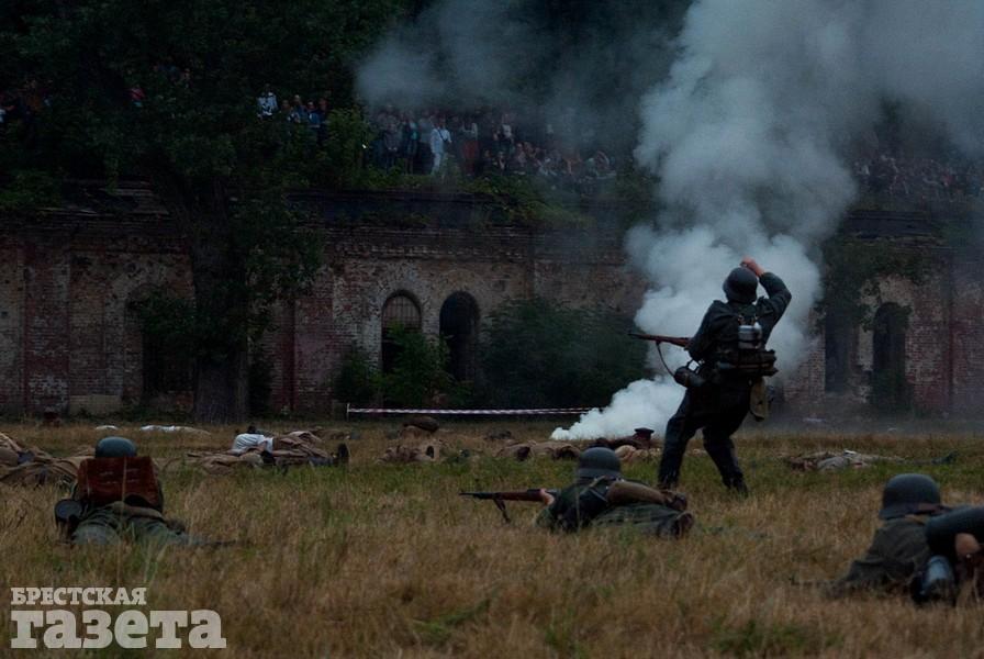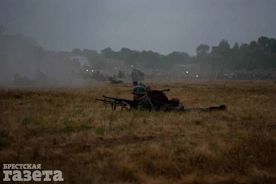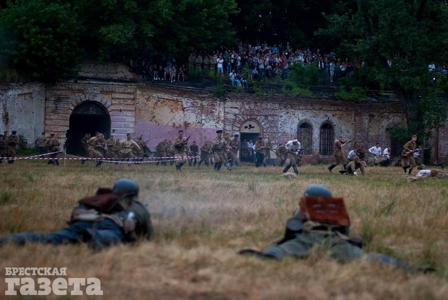 Началось действо с показа мирной жизни гарнизона и того, как войска НКВД отлавливали диверсантов. Эта картина сменилась внезапным артналетом фашистов. Одним из первых в бой с немецкой штурмовой группой вступил личный состав третьего батальона 84-го стрелкового полка под руководством Самвела Матевосяна. Его роль исполнил Олег Калашников из Воронежа.