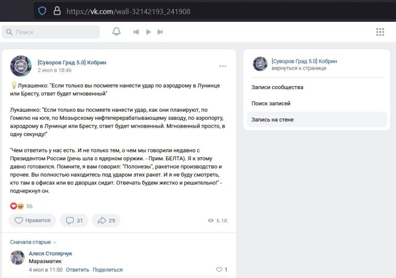 Брестская «Весна» нашла этот комментарий. Он состоит из одного слова: «маразматик». Написан под новостью от 2 июля с цитатой Лукашенко про то, что Беларусь сможет «жестко и мгновенно» ответить при помощи оружия в случае атаки на заводы или «аэродромы в Лунинце или Бресте».