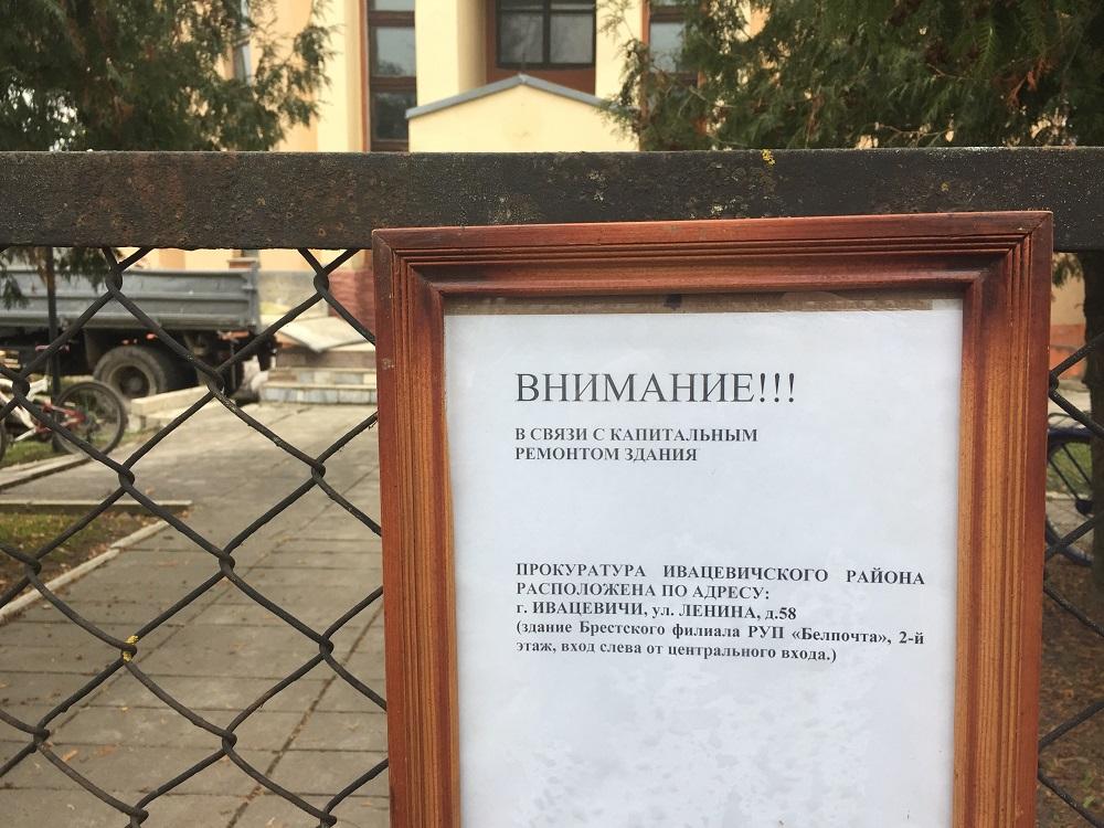 Работы уже начались, а прокуроры временно «переселились» в здание «Белпочты» на ул. Ленина, 58. О чем уведомляет табличка на воротах.