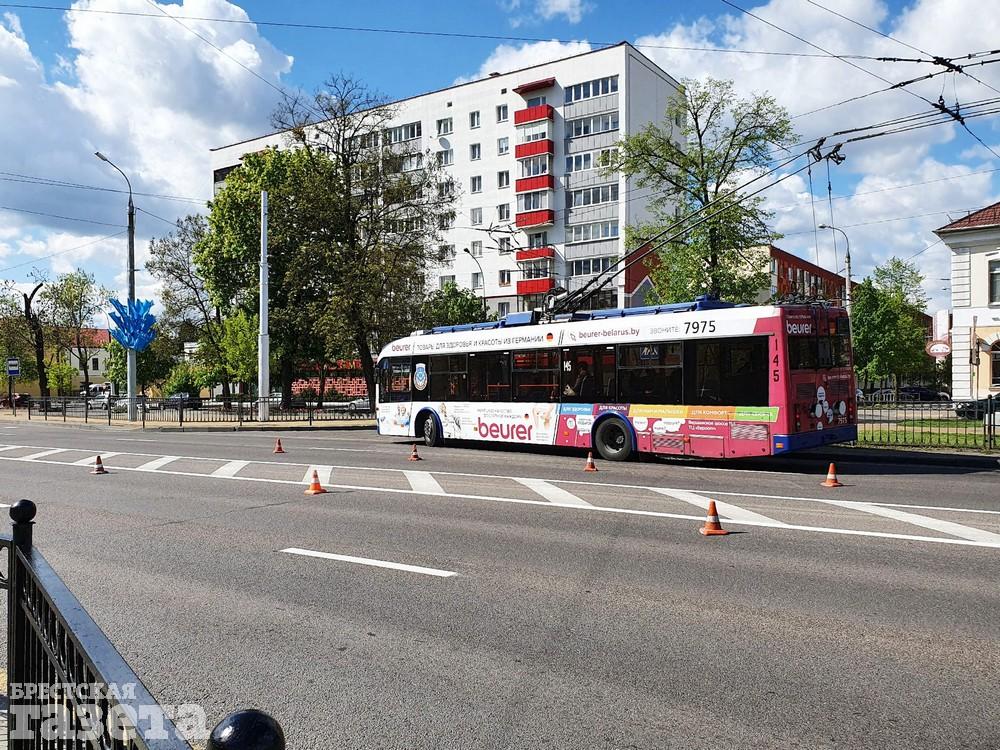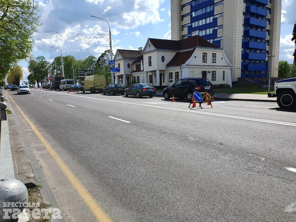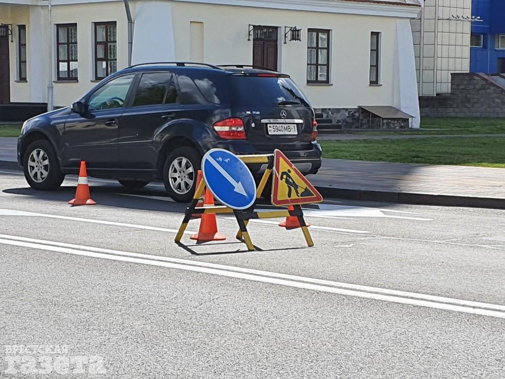В четверг 7 мая в Бресте обновляли дорожную разметку на главных улицах. Корреспондент «БГ» застала работников дорожных служб в этот день на улице Ленина и на проспекте Машерова.