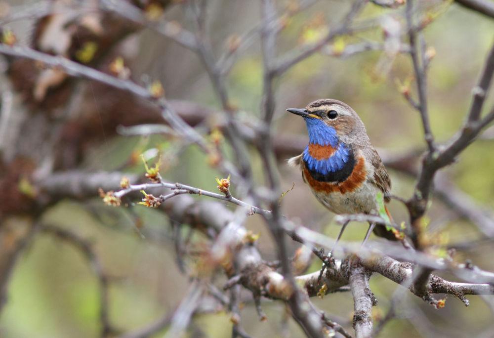 Стройная и изящная варакушка гнездится в кустарниках по берегам водоемов, живет скрытно и поет преимущественно вечером и ночью. Самец носит на груди яркое голубое кашне.
