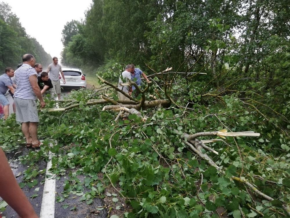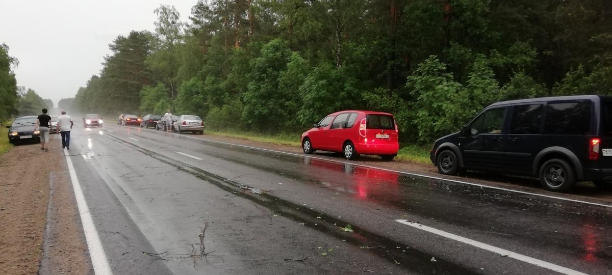 В Ляховичском районе сильный ветер повалил на проезжую часть деревья. Людям пришлось вручную расчищать себе проезд по трассе.