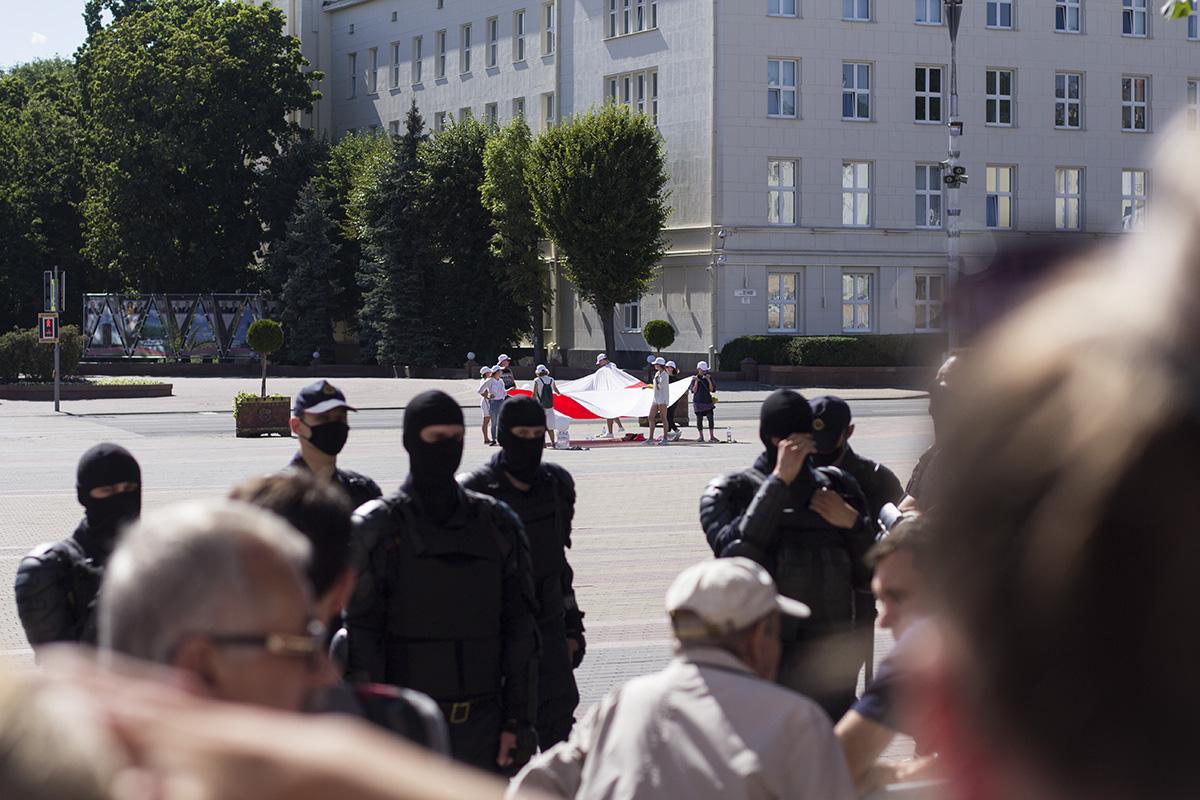Бело-красно-белый флаг в центре главной площади Бреста. Среди людей, которые его держат, и был Юрий Стыльский.