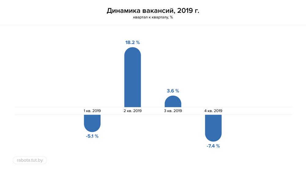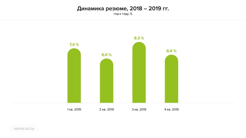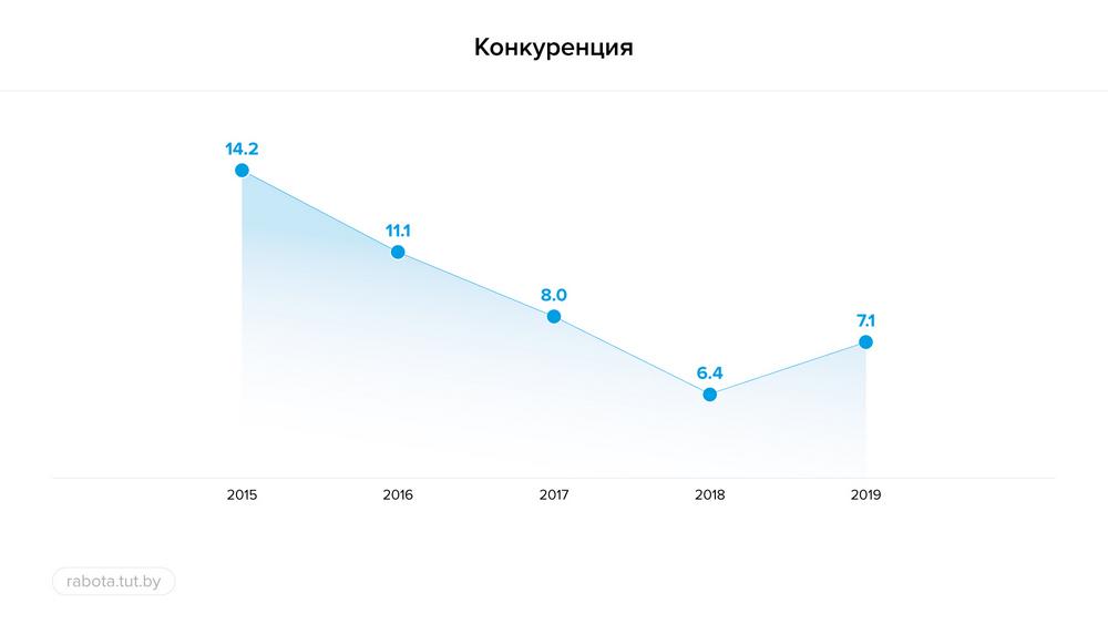 Сайт вакансий rabota.tut.by составил картину рынка труда 2019 года. Графики показывают, что начала повышаться конкуренция. В прошедшем году она составила 7,1%, а до того, с 2015 по 2018 годы, стабильно уменьшалась. Самый низкий уровень зафиксирован в 2018 году: 6,4%.