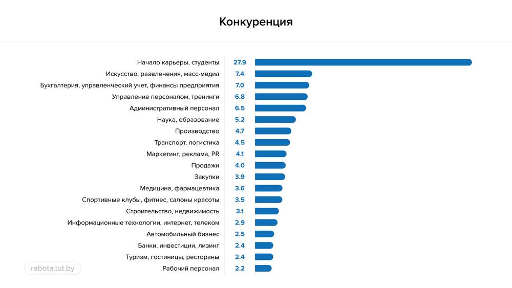 Самая высокая конкуренция на рынке труда в 2019 году была среди студентов и молодых специалистов. В процентах – 27,9. Дальше следует сфера искусств, развлечений и масс-медиа, а за ней – бухгалтерия, управленческий учет, финансы. Конкуренция в этих двух профобластях составила 7,4% и 7% соответственно. Наименьший процент желающих в отношении к количеству вакансий был на места рабочего персонала: 2,2.
