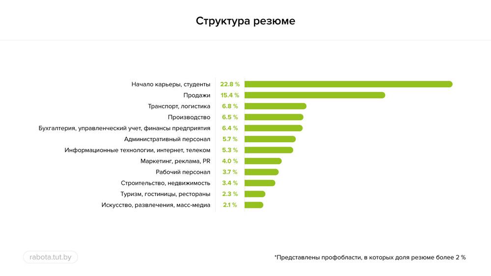 Что касается количества резюме, больше всего их было опубликовано студентами и людьми с минимальным опытом или без него: 22,8%. В сфере продаж также высокий процент – 15,4. Значительно меньше анкет в сфере транспорта и логистики: 6,8%. Однако эта профобласть вошла в топ-3 по количеству резюме.