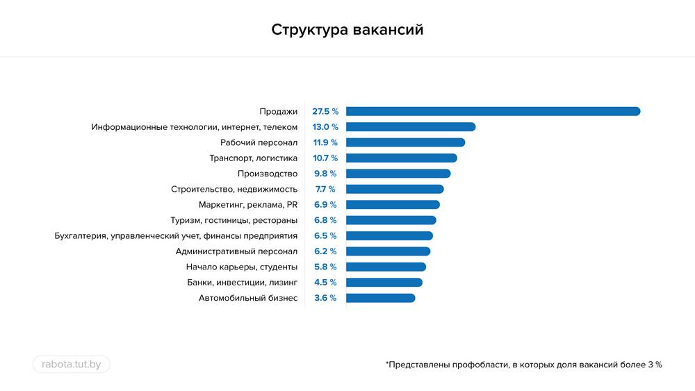 Список профобластей с самой высокой долей вакантных мест в 2019 году возглавили продажи. Здесь она составила 27,5%. На втором месте – информационные технологии, интернет, телеком. В этой области было 13% вакансий от общего количества на сайте. Почти 12% объявлений – для рабочего персонала. Доля вакантных должностей для тех, кто начинает карьеру, и студентов составила 5,8%. Эта профобласть на 11 месте в рейтинге прошлого года.
