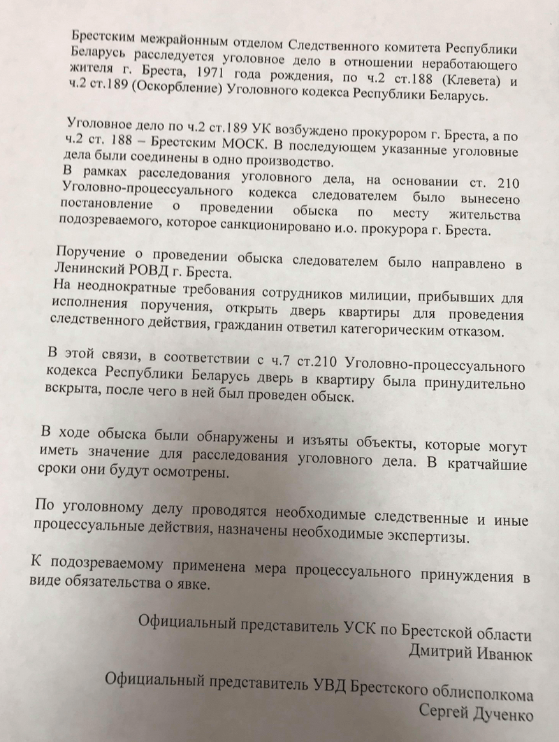 Уголовное дело по ч. 2 ст. 189 УК возбуждено прокурором Бреста, а по ч. 2 ст. 188 - Брестским МОСК.