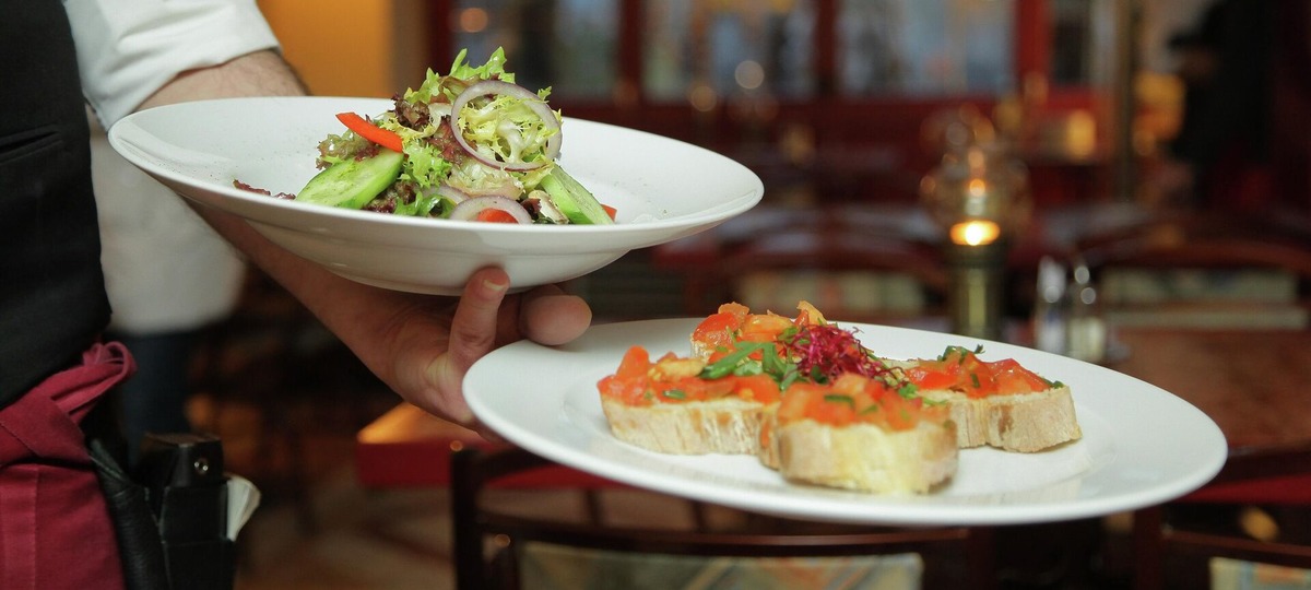Блюда в руке официанта. Иллюстративное фото
