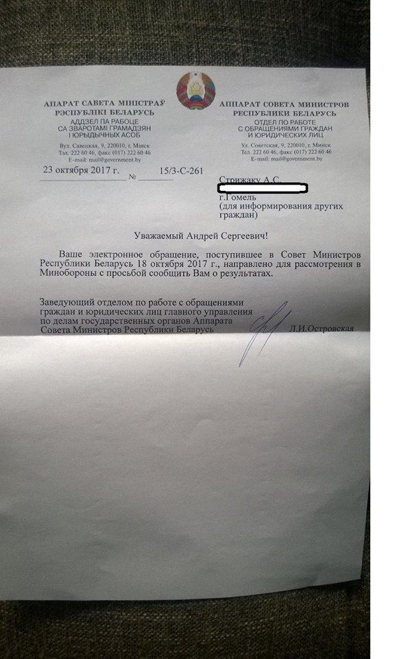 «Итак, Совмин решил отправить наше обращение в Минобороны. Ответ датирован 23.10, как и предыдущий ответ из Администрации президента, и забавно то, что уже на следующий день Лукашенко на совещании раскритиковал своих чиновников за «бюрократический футбол» с обращениями граждан. В общем, матч продолжается: первый пас администрация дала Совету Безопасности, второй пас Совмин дал Минобороны. Куда мяч в 9 614 подписей, собранных на Zvarot.by полетит еще?» — спрашивает на своей странице в Фейсбук Андрей Стрижак.